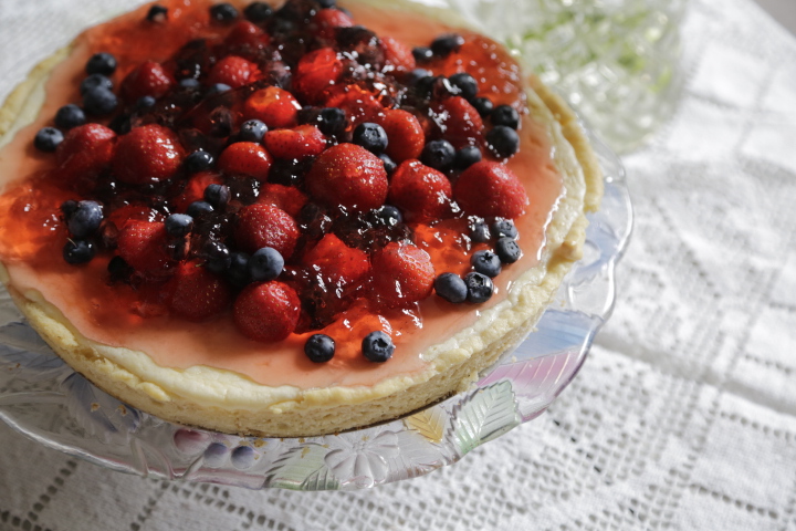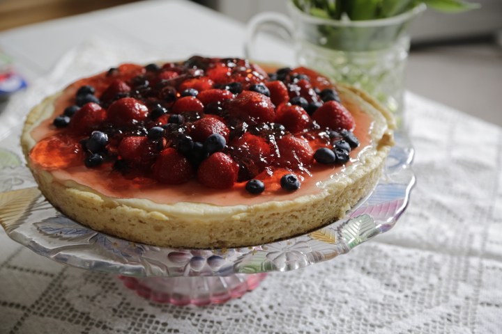 Przygotowanie galaretki – galaretkę rozpuścić w 450 ml wrzącej wody. Dokładnie wymieszać. Odstawić aż będzie prawie gęsta. Jak już będzie wystarczająco gęsta rozłożyć galaretkę na cieście, udekorować owocami.
