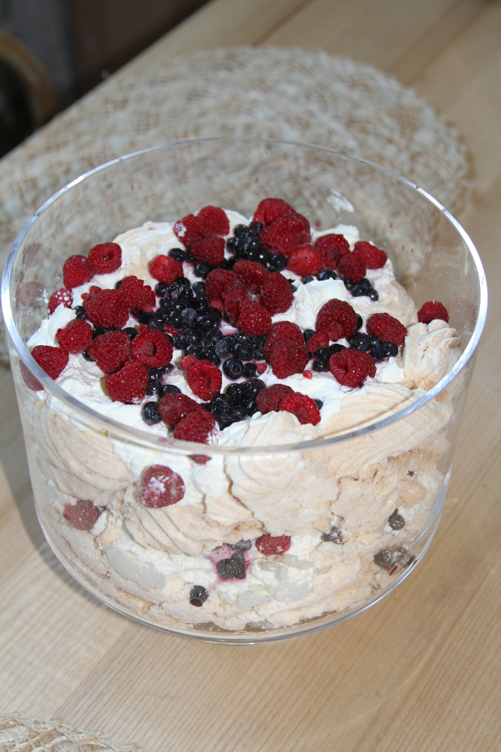 Potrzebne są trzy płyty bezowe, ubić śmietanę na sztywno. Na pierwszą warstwę rozsmarować częścią kremówki na to owoce. Znowu następna płyta bezowa, znowu kremówka i owoce. Ostatnia warstwa z płyty bezowa , śmietana i owoce. Jeżeli torcik zamierzacie zjeść trochę później, można dodać śmietan fix.