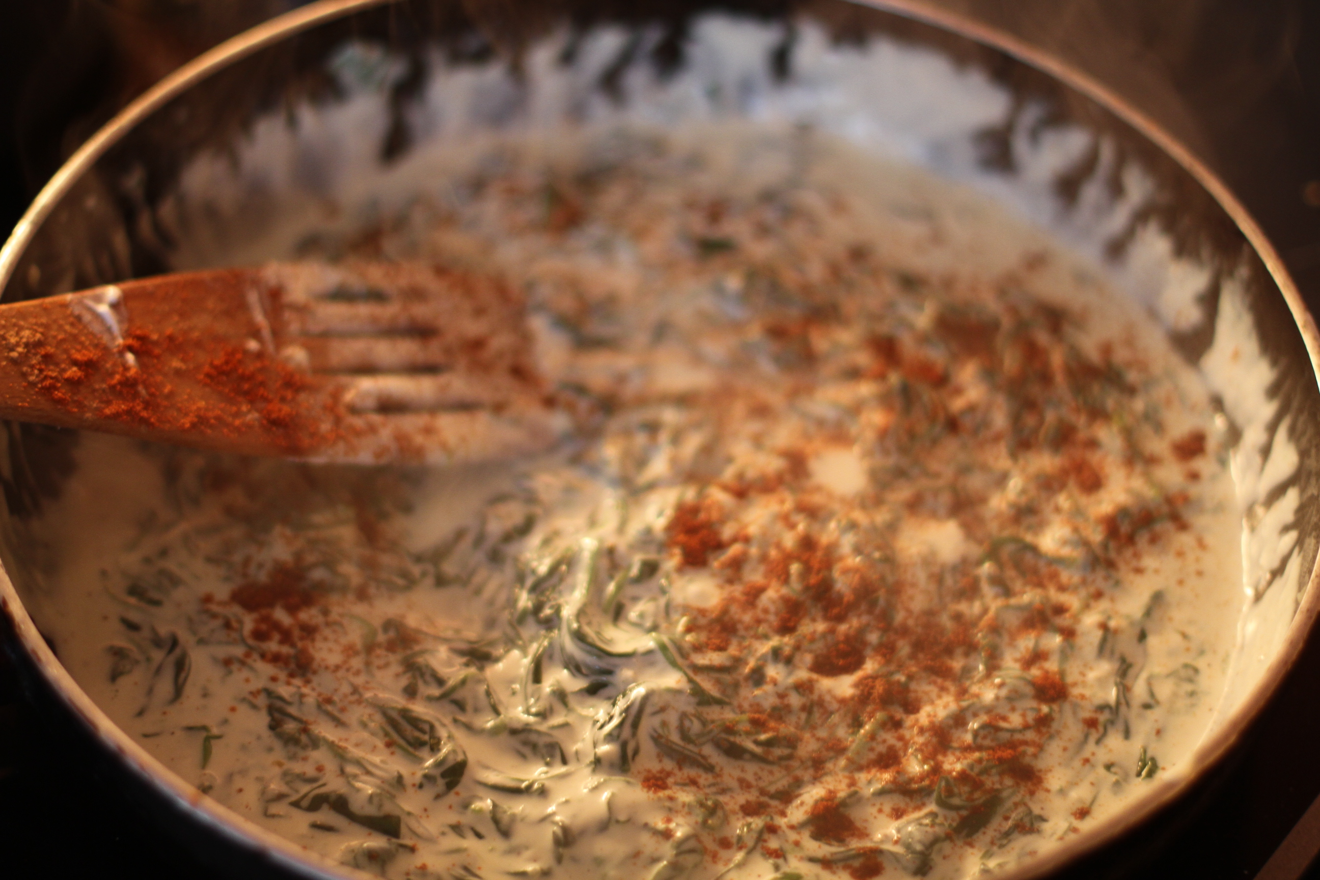 Na rozgrzaną patelnię wrzucić łyżkę masła, jak się roztopi wrzucić umyty i osuszony szpinak. Chwilkę smażyć, aż szpinak się rozgotuje. Dodać zmiażdżony czosnek, serek, gałkę muszkatołową, paprykę. doprawić solą i pieprzem.