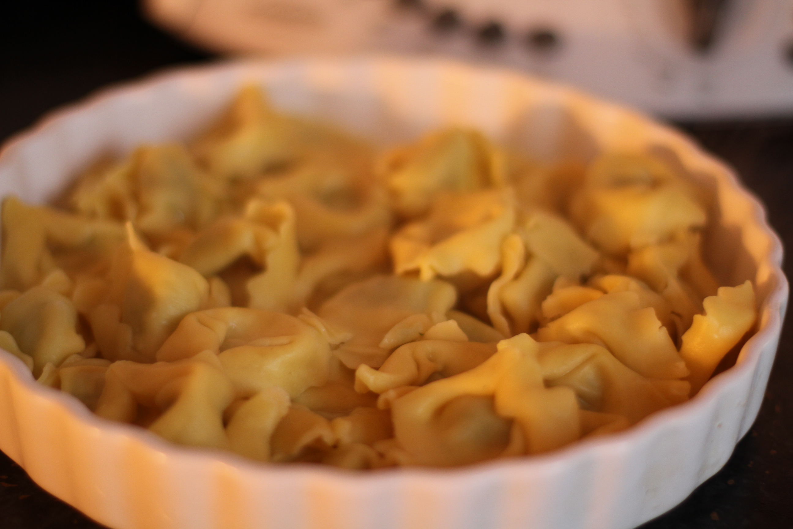 Wykonanie – wrzucić tortellini do wrzącej osolonej wody i gotować 3 minuty,odcedzić. Włożyć na dno żaroodpornego naczynia.