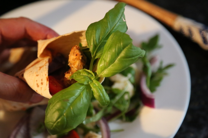 Przygotowanie mięsa – mięso pokroić w paski o grubości 1,5 cm. Doprawić solą, pieprzem, papryką słodką, chilli i suszoną bazylią. Jajko wbić do miseczki, rozbić. Kawałki mięsa obtoczyć najpierw w jajku a następnie w bułce tartej.
