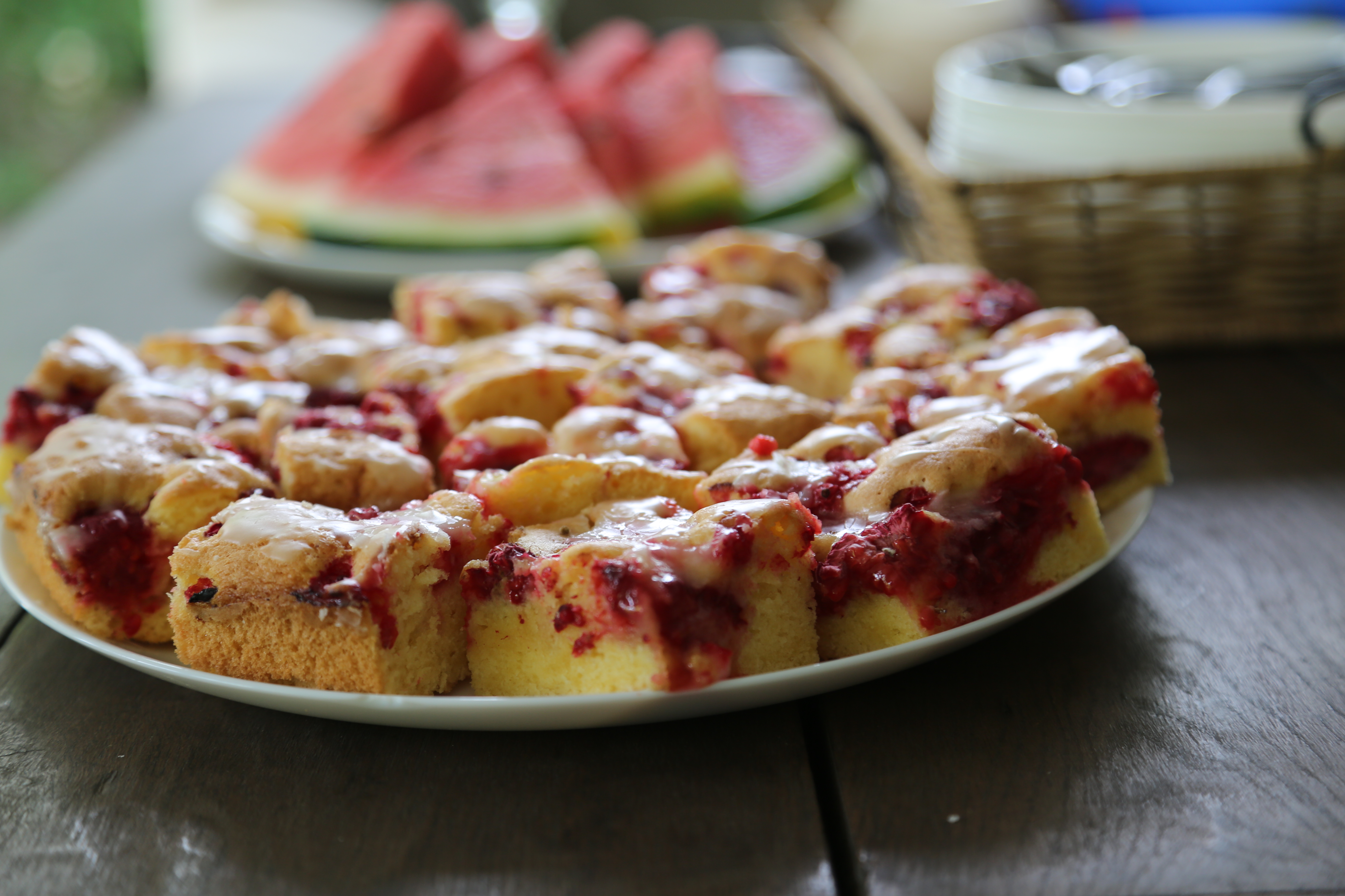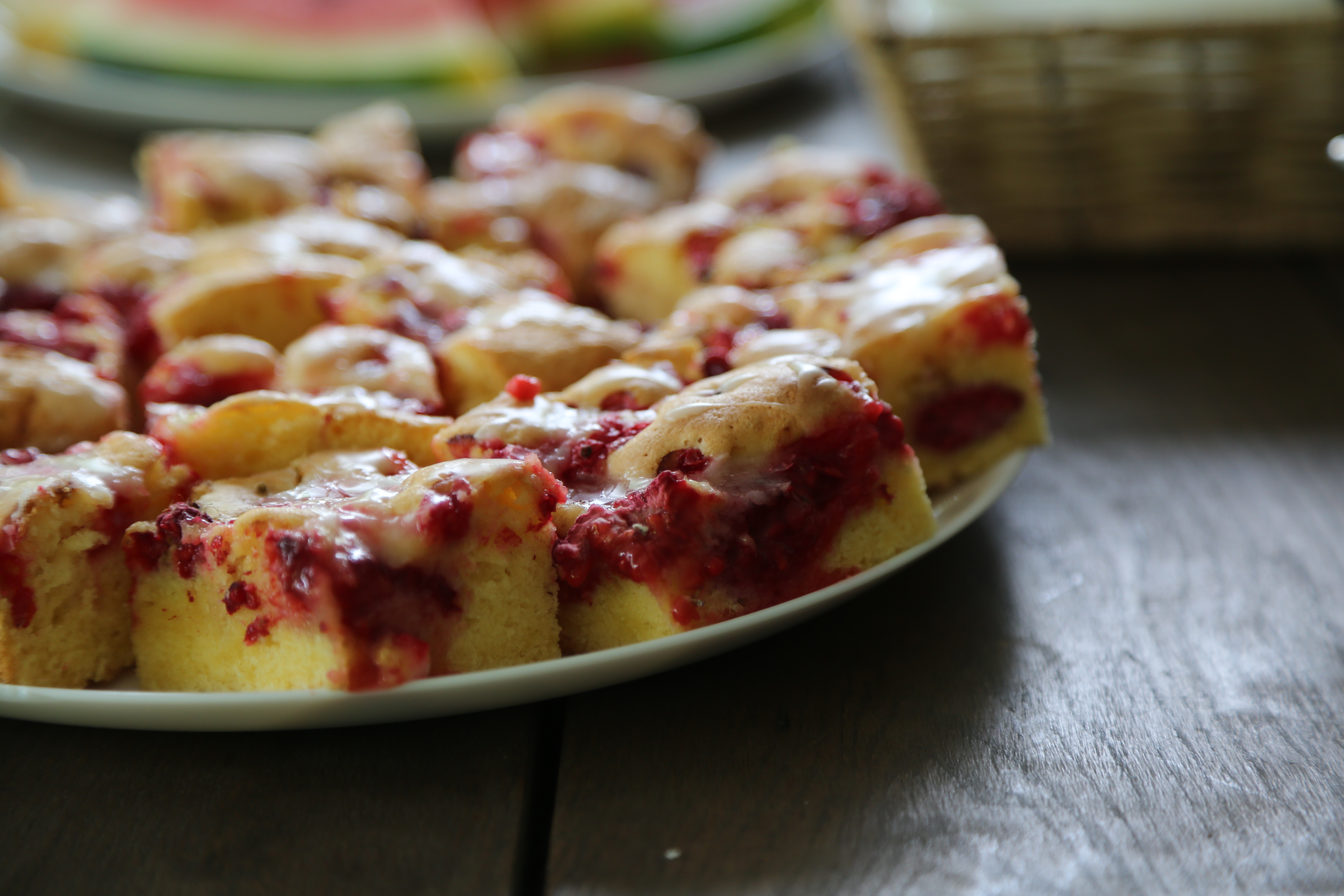 Pieczenie – nagrzać piekarnik do 190 C i piec ciasto 30 minut. Blaszkę o wymiarach  25 x 30 cm wyłożyć papierem do pieczenia. Wylać ciasto, obsypać owocami. Możecie obsypać samymi porzeczkami. Ja miałam maliny więc dodałam pół na pół z porzeczkami.