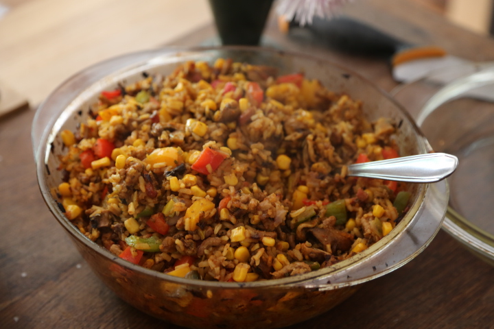 Cebulkę pokroić w piórka, czosnek posiekać drobno. Papryki oczyścić z błonek i pokroić w kosteczkę. Na patelni rozgrzać olej i obsmażyć na złoty kolor. Dodać mięso mielone, czosnek. Smażyć chwilkę aż mięso straci kolor surowizny. Wlać wywar, wymieszać i zagotować. Wszystko z patelni wlać do żaroodpornego naczynia.