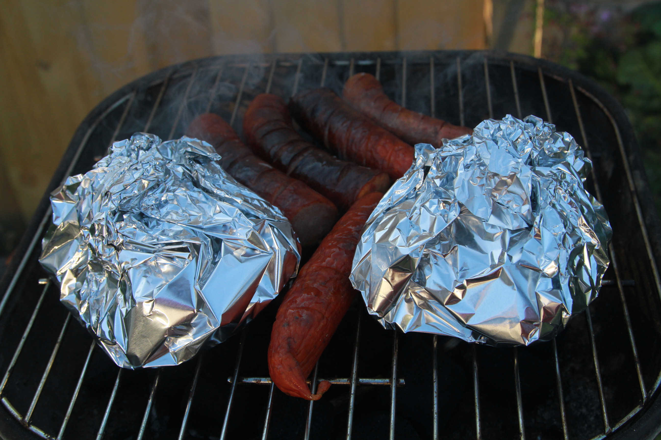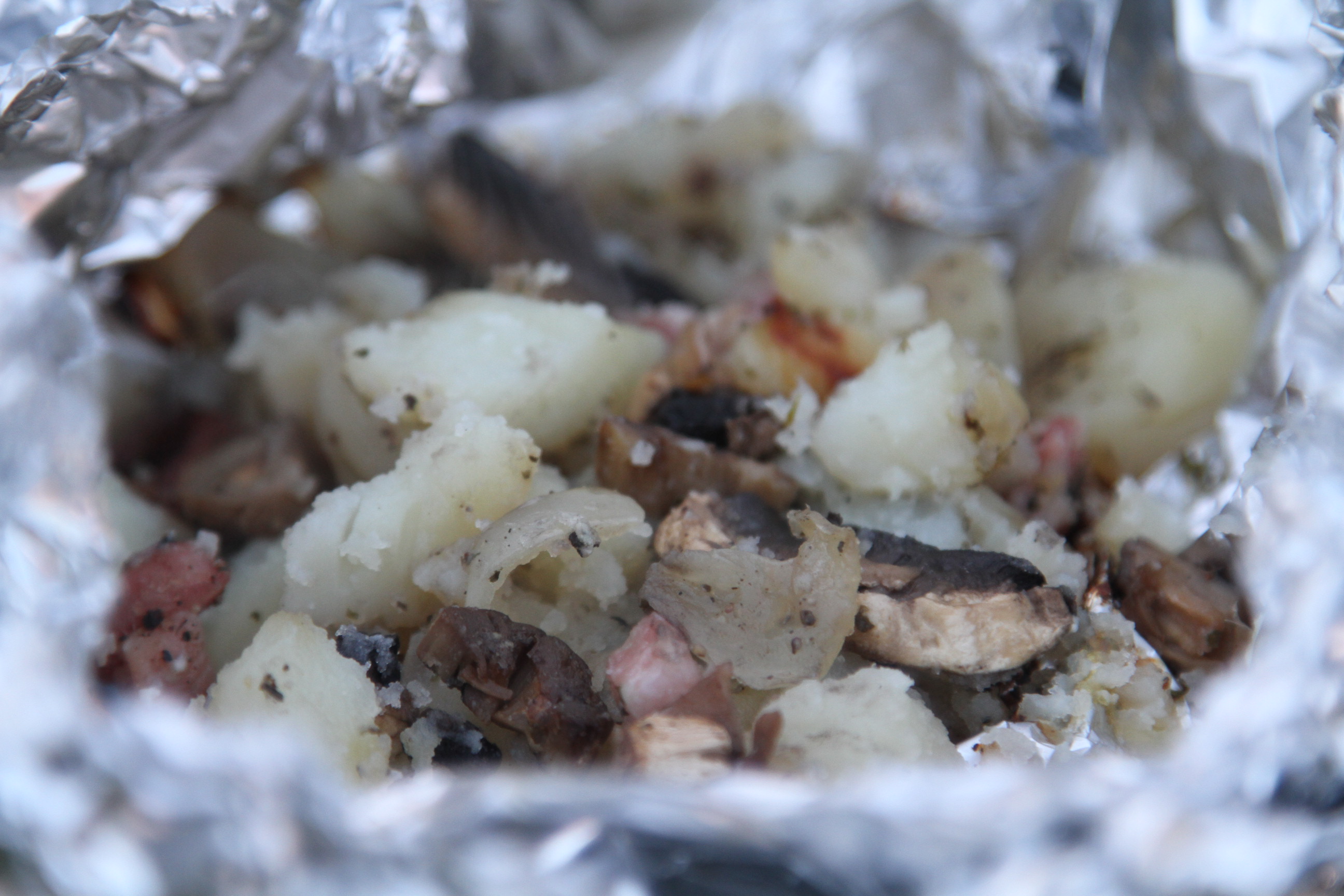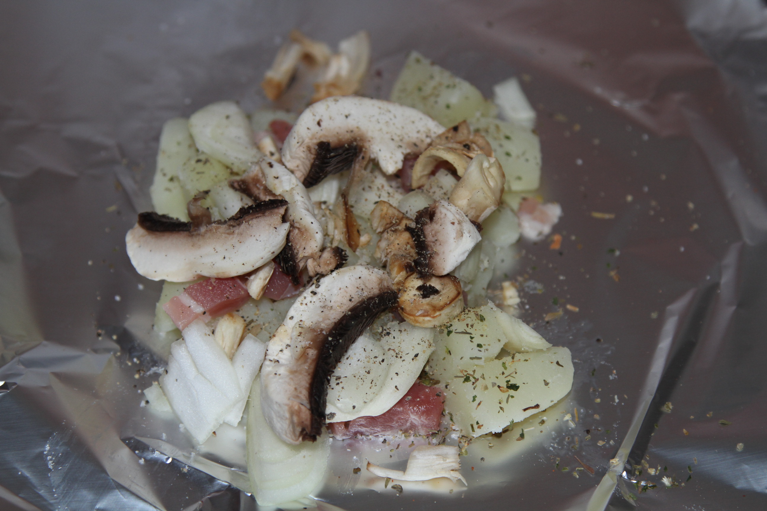 Folie pokroić na duże kwadraty, na każdą porcję rozłożyć po dwa arkusze folii aluminiowej. Ziemniaki obrać, pokroić i ugotować w osolonej wodzie, nie za bardzo miękko. Jak już są ugotowane, odcedzić i dokładnie odparować i osuszyć , trzymając ciągle garnek na gazie, lekko potrząsnąć garnek z ziemniakami, żeby wszystkie były suche. Rozłożyć ziemniaki na folii, na to pokrojony w kostkę boczek, plasterki cebuli i plasterki pieczarek jak kto lubi. Posypać przyprawami, dokładnie zamknąć i położyć na grillu.